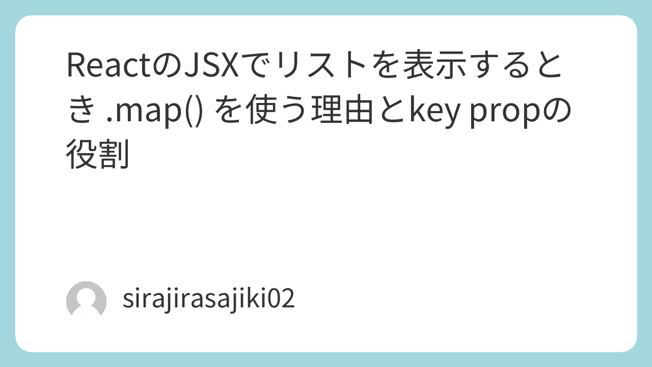 {}の中には「式」しか書けないためfor文は使えない .map()は配列を返す「式」なのでJSXの中で使える.map()で生成した要素には一意なkeyprop を付けるkeyにはインデックスではなくデータのidを使う